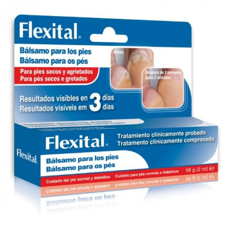 Flexital Bálsamo Pés Secos Diabético promove a hidratação da pele seca e gretada da planta dos pés e calcanhares.