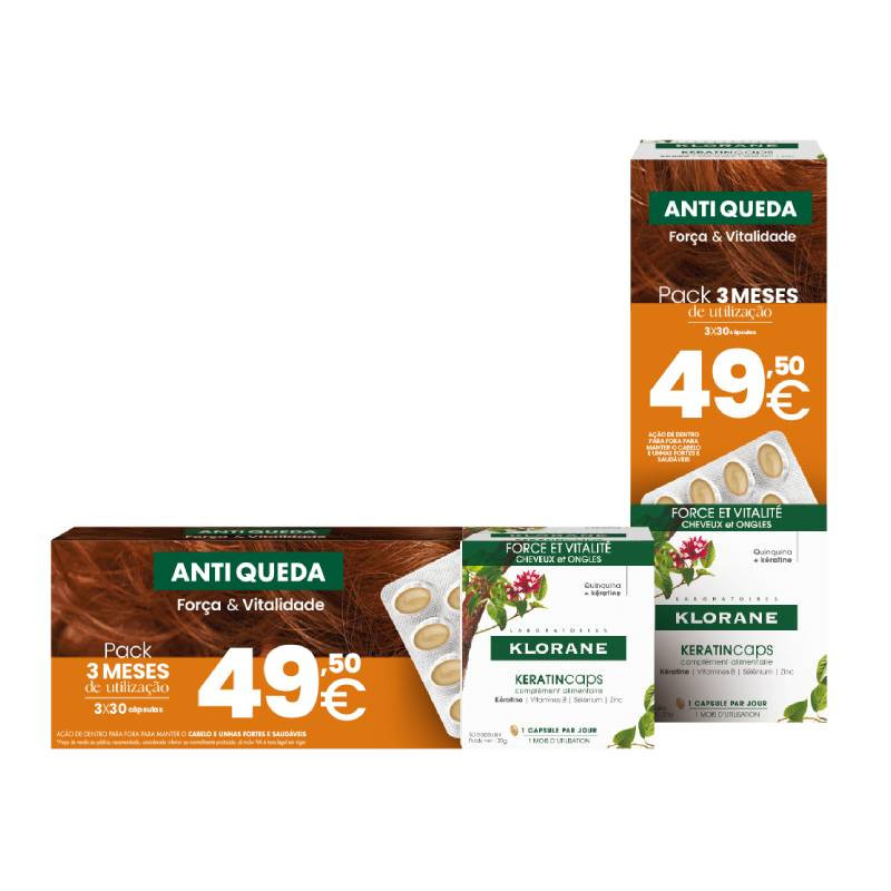 Klorane KeratinCaps Pack 3 Meses é um pack promocional composto por 3 embalagens de 30 cápsulas.