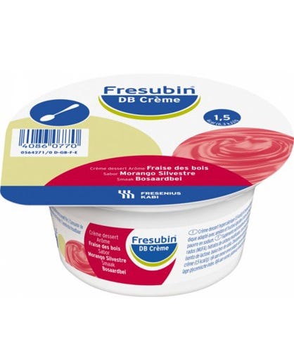Fresubin DB Creme é um suplemento oral hipercalórico (1,5 kcal/g), hiperproteico e com fibra. Contém alto teor em lípidos monoinsaturados e um perfil de hidratos de carbono adaptado com baixo índice glicémico para um melhor controlo da glicémia. Apresenta uma consistência semi-sólida. Contém açúcar e edulcorantes. Possui baixo teor em sódio e em colesterol. Isento de lactose e glúten. Está indicado para satisfazer as necessidades nutricionais de indivíduos com ou em risco de malnutrição associada à doença, em particular para indivíduos com metabolismo da glicose alterado ou disfagia (dificuldade em engolir).