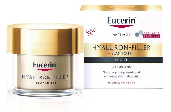 Eucerin Hyaluron-Filler + Elasticity Creme Noite devolve elasticidade, firmeza e resistência à pele. Combina na sua composição Arctiina que acelera o processo de renovação do colagénio nas células da pele, ao mesmo tempo que a Silimarina protege o colagénio e a elastina do stress oxidativo. A pele fica mais firme e com uma maior elasticidade. A Silimarina permite também que a pele fique mais fresca e radiante. Com ácido hialurónico, presente na sua composição, preenche as rugas mais profundas. Boa tolerância.