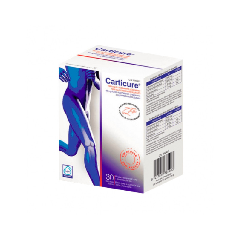 Carticure Saquetas é um suplemento alimentar com glucosamina e condroitina que contribui para o normal funcionamento das articulações ajudando a manter a sua flexibilidade e saúde. A sua fórmula contém Cloridrato de Glucosamina 1500mg, Sulfato de Condroitina 1200mg, Vitamina C 80mg e Sulfato de Manganês (2mg Mn). Sabor a laranja. Quantidade: 30 saquetas. Como utilizar: 1 saqueta por dia, de preferência depois de uma refeição.