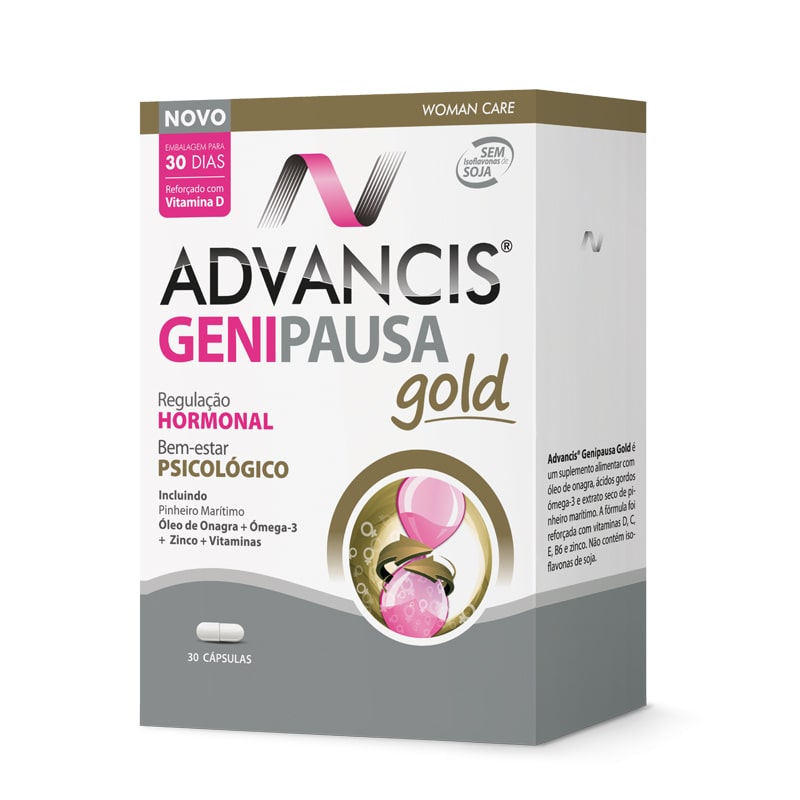 Advancis® Genipausa Gold é um suplemento alimentar especialmente formulado para ajudar no equilíbrio hormonal e bem-estar psicológico da mulher, contribuindo para o alívio dos sintomas da menopausa, sem isoflavonas de soja. Da sua fórmula fazem parte o óleo de onagra, ácidos gordos ómega-3 e extrato seco de pinheiro marítimo. A fórmula foi reforçada com vitaminas D, C, E, B6 e zinco.