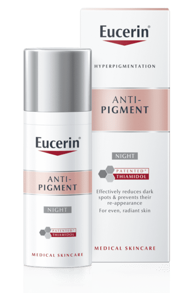 Eucerin Pigment Creme Noite contém Thiamidol, um ingrediente patenteado e eficaz que atua na raiz da hiperpigmentação reduzindo a produção de melanina. Contém Dexpantenol, um ingrediente ativo conhecido por contribuir para a regeneração da pele durante a noite. A pele fica uniforme e radiante.