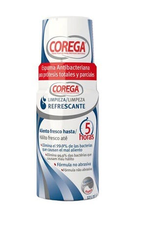 Corega Espuma Limpeza Prótese dentária é uma alternativa muito prática, especialmente formulada para não danificar a prótese dentária. Escovar com esta espuma de limpeza não abrasiva, que contém micro bolhas, ajuda a eliminar as manchas e 99,9% das bactérias que causam o mau hálito. Contém uma combinação de óleos mentolados que permite sentir uma frescura extra.