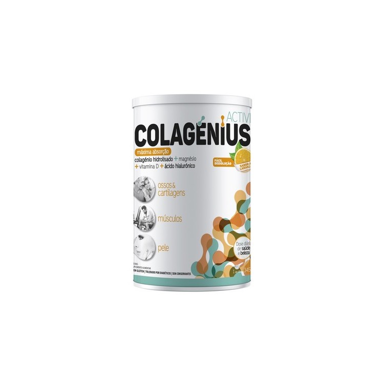 Colagenius Active Laranja é um suplemento alimentar em pó à base de Colagénio, Ácido hialurónico, Magnésio, Vitamica D e Vitamina C. A vitamina C contribui para a normal formação de colagénio para funcionamento normal das cartilagens, dos ossos e da pele. A vitamina D e o Magnésio contribuem para a manutenção de ossos normais e funcionamento muscular.