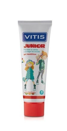 Vitis Junior Gel Dentífrico é um gel de baixa abrasividade, que promove a prevenção de cáries e proteção das gengivas. Indicado para crianças com idade superior a 6 anos. Contém fluoreto de sódio (1.450 ppm). Sabor a Tutti Frutti. Sem açúcar, glúten ou lactose.