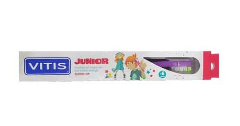Vitis Junior Escova Dentes é uma escova de dentes com tampa protetora, cabo ergonómico e cabeça pequena arredondada, adaptáveis à mão e boca de criança. Com estrias antideslizantes. Possui filamentos suaves com uma zona de impacto monotip que desagrega a placa dentária.