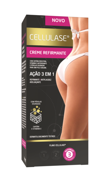 Cellulase Creme Refirmante Ação 3-Em-1 tem ação refirmante, anti-Flacidez e adelgaçante, com cafeína, emolientes, pérolas douradas para iluminar a pele e Vitamina E antioxidante.