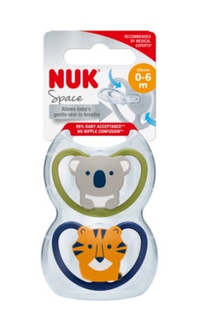 Nuk Space Chupeta tem orifícios de ventilação que permitem o máximo de circulação de ar, permitindo a respiração da pele. A embalagem permite o transporte e a higienização de chupetas no microondas.