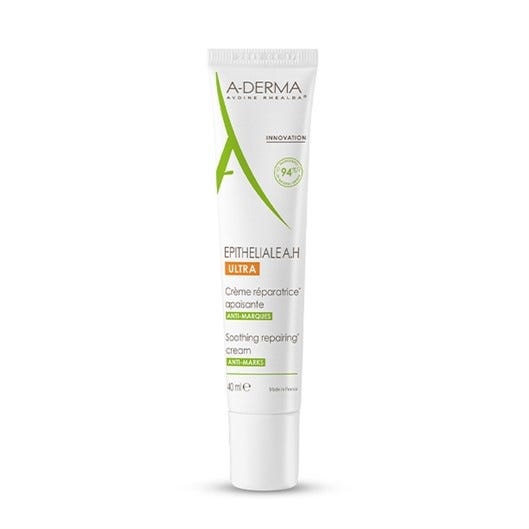 A-Derma Epitheliale A.H Ultra Creme reparador calmante antimarcas contém extrato de plântulas de aveia rhealba, dipéptido L-alanina-L-glutamina e ácido hialurónico, oferecendo uma ação tripla. Hidrata e promove a reparação da pele frágil, reduz o aspeto das marcas cutâneas e suaviza as sensações cutâneas desagradáveis após cuidados estéticos superficiais ou danos cutâneos superficiais.