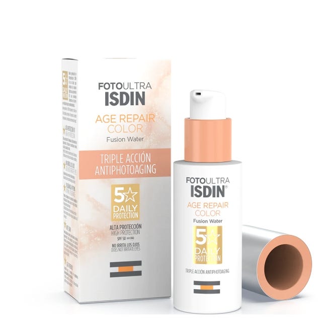 ISDIN Foto Ultra Age Repair Fusion Water SPF 50 é um protetor solar ultraligeiro e de uso diário que proporciona hidratação intensa, absorção imediata e oferece uma tripla ação antifotoenvelhecimento. Protege a pele do sol e da poluição, repara o dano solar acumulado a nível celular. Não comedogénico. Oil-free. Hipoalergénico.