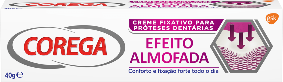 Corega Efeito Almofada Creme fixativo para próteses dentárias ajuda a amortecer com uma camada efeito almofada durante todo o dia. Ajuda a dar conforto e a proteger as gengivas da irritação. Fácil aplicação com aplicador de precisão. Fixação forte, todo o dia.