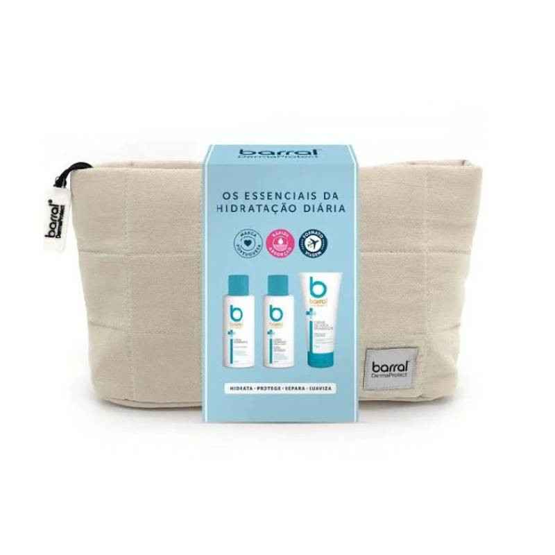 Barral Dermaprotect Kit Viagem Oferta Necessaire é um pack promocional composto por 3 cuidados: Barral Dermaprotect Creme Banho (100ml), Barral Dermaprotect Creme Hidratante Corpo (100ml) e Barral Dermaprotect Creme Mãos Reparador FPS15 (75ml).