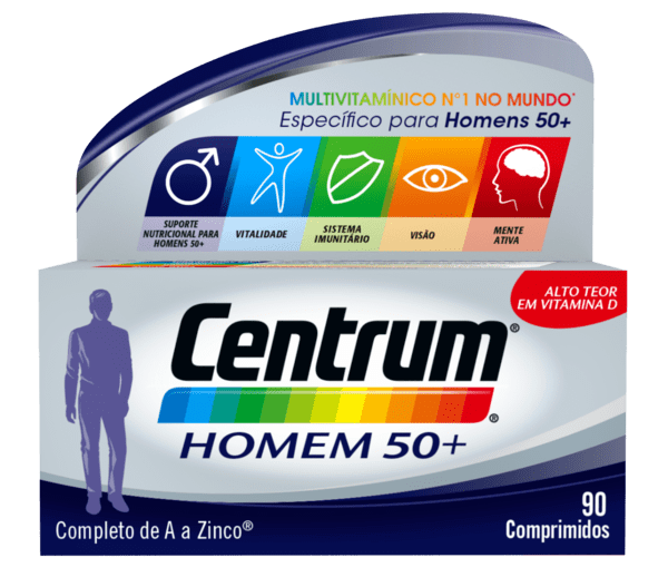 Suplemento alimentar com vitaminas e minerais, que ajuda a satisfazer as necessidades nutricionais específicas de homens com mais de 50 anos.