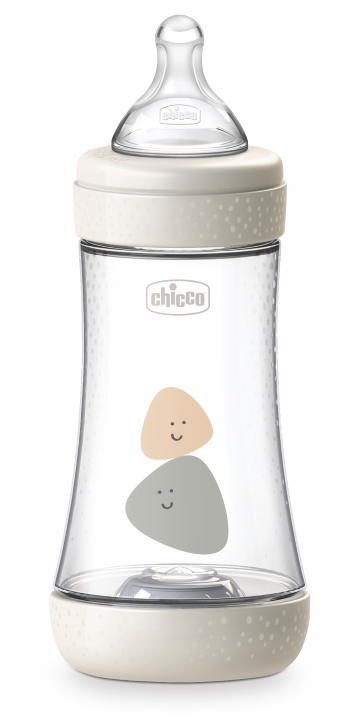 Chicco Perfect5 Biberão promove o ritmo natural de sucção e uma alimentação tranquila. Apresenta o sistema intui-flow que combina a tetina Physio e a Membrana Equilibrium. Esta tetina, de silicone, é simétrica, alongada e achatada para simular o mamilo da mãe; tem uma textura suave e macia que lhe confere uma sensação aveludada, para uma sucção o mais confortável e natural possível. Possui também 4 fluxos diferentes (normal, regulável, rápido e fluxo papa) para acompanhar o crescimento do bebé. A Membrana Equilibrium, uma membrana anticólicas, permite que o ar entre pela base do biberão, sem de misturar com o leite, evitando a regurgitação, a formação de gases e cólicas. A membrana é flexível e adapta-se às diferentes intensidades de sucção. O biberão é desmontável, com a base removível, permitindo uma lavagem fácil e rápida.