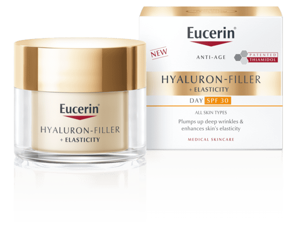 Eucerin Hyaluron Filer Elasticity Creme Dia Spf30 tem Arctilina que ajuda a acelerar o processo de renovação de colagénio nas células da pele. A fórmula com Óleo de Cardo Mariano hidrata e nutre a pele, ficando fresca e radiante. O Ácido Hialurónico ajuda a preencher visivelmente até as rugas mais profundas. Excelente base de maquilhagem. Não comedogénico.