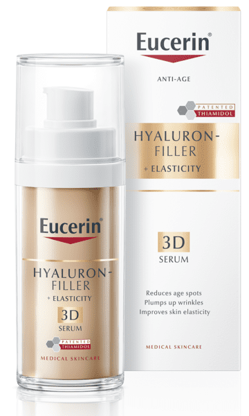 Eucerin Hyaluron Filler Elasticity Sérum 3D ajuda a preencher as rugas mais profundas, devido ao Ácido Hialurónico. A Actiinia acelera o processo de renovação de colagénio nas células da pele. O Thiamidol ajuda a reduzir as manchas de idade e previne o seu reaparecimento. Boa base para cuidado de dia ou para cuidado de noite. Não comedogénico.
