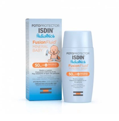 Fotoprotector ISDIN Pediatrics Fusion Fluid Mineral Baby SPF 50 é um protetor solar fluido com filtros físicos especialmente formulado para a pele frágil do bebé. A sua tecnologia Fuison Fluid funde-se na pele, oferecendo elevada proteção e hidratação para a pele mais sensível. Muito resistente à água. Adequado a todos os tipos de pele, incluindo pele intolerante a filtros solar químicos e/ou atópica. Hipoalergénico.