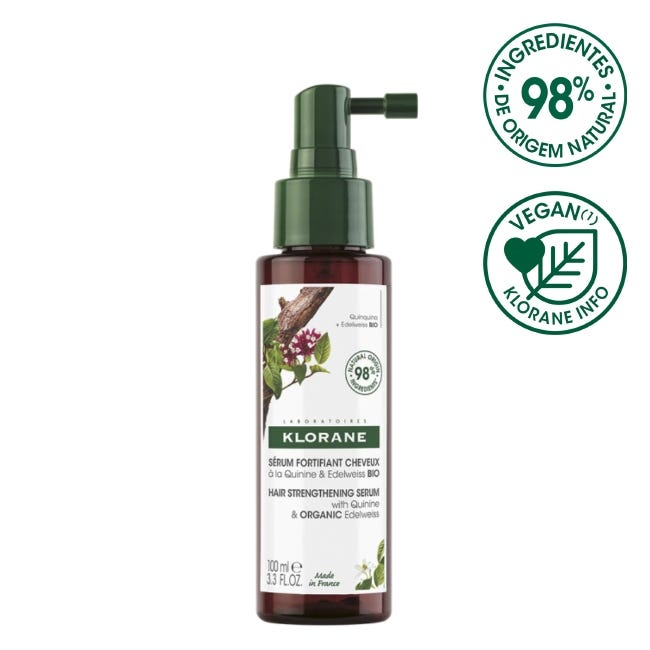 Klorane Quinina e Edelvaisse Bio Sérum antiqueda é um cuidado antiqueda sem necessidade de enxaguar, que fortalece o cabelo, abranda a queda e favorece o seu crescimento. O spray não é oleoso nem colante, facilitando a sua aplicação. Fórmula vegan natural. Para todos os tipos de queda de cabelo.