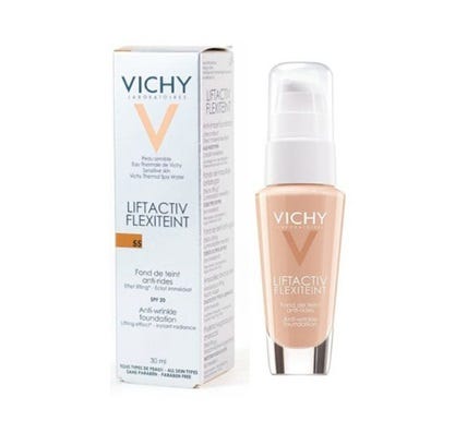 Vichy Liftactiv Flexiteint base antirrugas tem uma textura de silicone tensor para um efeito lifting radiante durante todo o dia, sem rigidez dos traços. Formulada com collagyl, um constituinte ativo antirrugas, que preenche as rugas, deixando a pele mais lisa e restituindo o seu aspeto inicial. Apresenta um fator de proteção solar médio (SPF 20). A sua textura fluída confere um efeito matificante de longa duração e uma melhor fixação da maquilhagem. Não comedogénico.