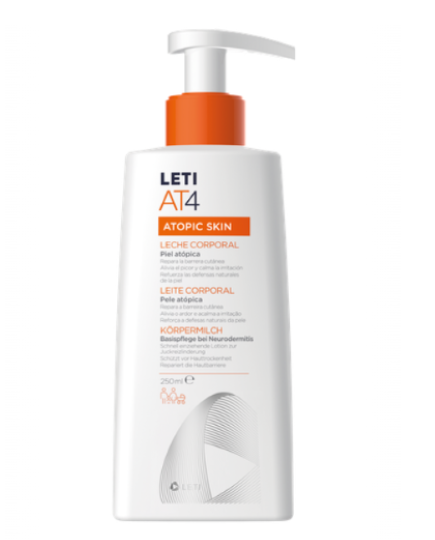 LetiAT4 Leite corporal apresenta uma fórmula emoliente específica para o cuidado diário da pele atópica. Ajuda a reparar a barreira cutânea, a aliviar a comichão e irritação, e a diminuir risco de sobreinfecção, proporcionando uma sensação de conforto na pele. Hipoalergénico.
