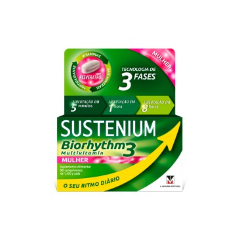 Sustenium Biorhythm3 Multivitamin Mulher Comprimidos é um suplemento alimentar com tecnologia de 3 fases desenvolvido especialmente para a mulher. Multivitamínico e multimineral aconselhado em caso de carência ou quando o corpo tem uma necessidade aumentada para os micronutrientes contidos no produto, para atender às necessidades vitamínicas do seu corpo. A tecnologia de 3 fases com libertação faseada garante a libertação de vitaminas e dos minerais nas diferentes fases do dia para dar resposta às exigências nutricionais do organismo e reforçar o seu desempenho para todas as atividades diárias. Como tomar: 1 comprimido por dia com um copo de água.