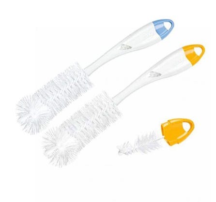 Escovilhão 2 em 1 especialmente concebido para a limpeza de biberões e tetinas.