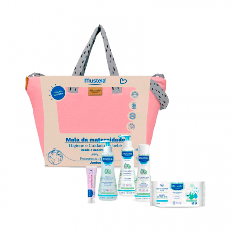 A Mala de Maternidade Mustela é composta pelos seguintes produtos: Gel Lavante suave 200 mL:Especificamente formulado para o recém-nascido, é ideal para a higiene diária do bebé, deixando a pele e os cabelos do bebé limpos e suaves. A delicadeza da pele e do couro cabeludo são respeitados, graças à sua fórmula sem sabão.Hydra-Bebé Corpo de 300 mL:Leite hidratante e suavizante para a pele dos recém-nascidos e dos bebés. Penetra instantaneamente e hidrata duradouramente, deixando a pele suave e sedosa.Água de Limpeza 300mL:Especificamente formulada para uma utilização desde o nascimento, a água de limpezaé ideal para a higiene do bebé, limpando todas as impurezas do rosto, do corpo e das nádegas. A pele fica suave, graças ao Extrato de Aloé Vera e à Alantoína. Graças à elevada tolerância cutânea e ocular, respeita as peles mais delicadas e não arde nos olhos.Creme Zona da Fralda 50 mL:Previne as irritações e vermelhidões em cada muda da fralda, aliviando e reparando a epiderme desde a 1ª aplicação.Toalhetes de Água 60 Unidades:Especificamente formulados para os bebés desde o nascimento, são ideais para a muda da fralda do bebé tanto em casa, como em viagem uma vez que a pele das nádegas fica totalmente limpa, suave e aliviada e delicadamente perfumada.