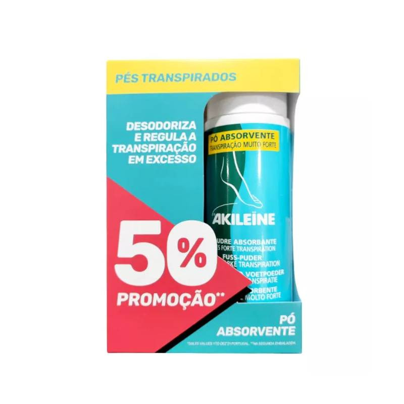 Akileine Duo Pó Absorvente Mico-Preventivo 2x75g Desc 50% 2ªEmbalagem é um pack promocional composto por duas embalagens de 75g. Akileine Duo Pó Absorvente Mico-Preventivo é um pó absorvente, para o cuidado dos pés com tendência a transpiração excessiva e aparecimento de micoses. Propriedades: