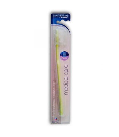 Elgydium Clinic Escova de Dentes Periodôntica é uma escova de dentes ultra-suave com um corte das cerdas especial, em forma de V invertido para que as cerdas, durante a escovagem, incidam nas gengivas de forma ainda mais suave. Esta escova está particulamente indicada para pacientes com problemas gengivais (nomeadamente gengivites ou periodontites), cuja fragilidade das gengivas esteja aumentada, resultando num desconforto acrescido durante a escovagem. Eficaz para alterações da mucosa oral. Eficaz para gengivas frágeis ou sensíveis. Destinada a adultos e adolescentes. Com Cerdas Tynex® de 0,15 mm finamente arredondadas, cabo flexível com ligação fina e caixa protetora.