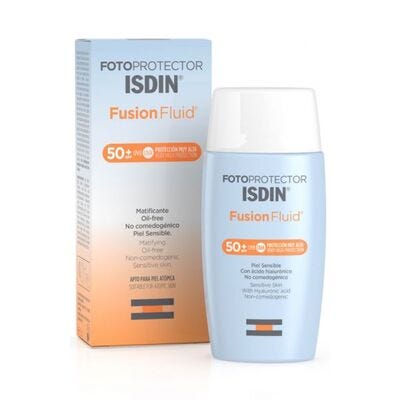 Fotoprotector ISDIN Fusion Fluid SPF 50+ é uma emulsão ultraligeira que se funde com a pele. A sua textura fluida permite uma aplicação fácil, tendo uma absorção imediata. Com um tato ligeiro e matificante, não seca a pele e deixa-a sem brilho.