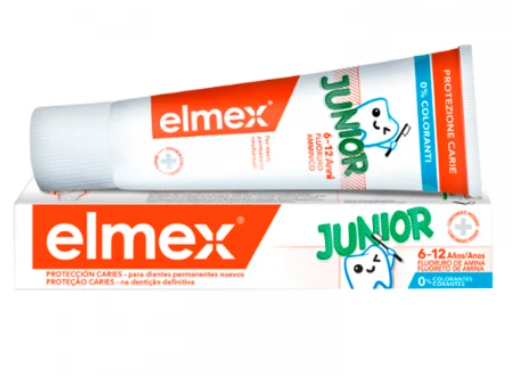 Elmex Junior Pasta dentífrica, com flúor (1400ppm), fluoreto de amina e olaflur, indicada para a higiene oral diária, protege contra cáries na dentição definitiva de crianças entre 6 e os 12 anos de idade e estimula a remineralização do esmalte durante os estágios iniciais da descalcificação.
