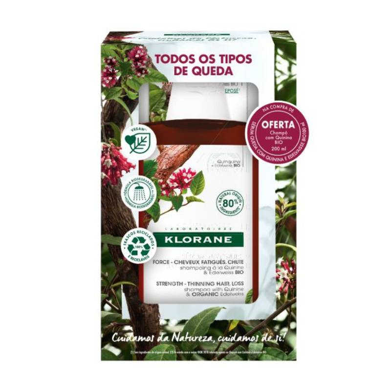 Klorane Capilar Quinina e Edelvaisse Bio Sérum Oferta Champô é um pack composto por 2 cuidados antiqueda: Klorane Capilar Quinina e Edelvaisse Bio Sérum (100ml) e Klorane Capilar Quinina Bio Champô (200ml). Klorane Capilar Quinina e Edelvaisse Bio Sérum é um cuidado fortificante, indicado para cabelos desvitalizados e com tendência a queda. A fórmula contém quinina que ajuda a reduzir a queda; Edelvaisse Bio que favorece o crescimento e regula os ciclos do cabelo; e manganésio e vitaminas B que aumentam a microcirculação do couro cabeludo. Devolve força e vitalidade ao cabelo. Textura não oleosa. Sem silicones nem óleos minerais. Klorane Capilar Quinina Bio Champô é um cuidado de higiene capilar fortificante, indicado para cabelos desvitalizados e com tendência a queda. A fórmula contém extrato de quinquina; vitaminas do complexo B; e Edelvaisse Bio. Lava suavemente e favorece o crescimento do cabelo, devolvendo força e vitalidade. Ideal como complemento a outros cuidados antiqueda. Sem silicones, sulfatos e óleos minerais.