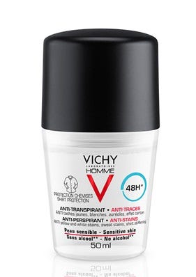 Vichy Desodorizante Roll-On Antitranspirante 48H Antimanchas Brancas e Amarelas suaviza e proporciona proteção antitranspirante até 48 horas. Previne o aparecimento de manchas amarelas nos tecidos claros e resíduos que podem endurecer a roupa. Antimanchas brancas em roupa escura. Hipoalergénico. Testado dermatologicamente.