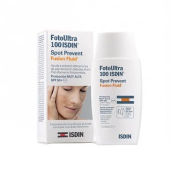 FotoUltra ISDIN 100 Spot Prevent Fusion Fluid 50+ oferece uma proteção face aos raios UVA, que estimulam o processo de pigmentação, 3 vezes superior ao mínimo requerido num protetor solar SPF 50+. Melhora a elasticidade da pele e diminui as rugas graças ao Ácido Hialurónico. A sua textura Fusion Fluid funde-se com a sua pele.