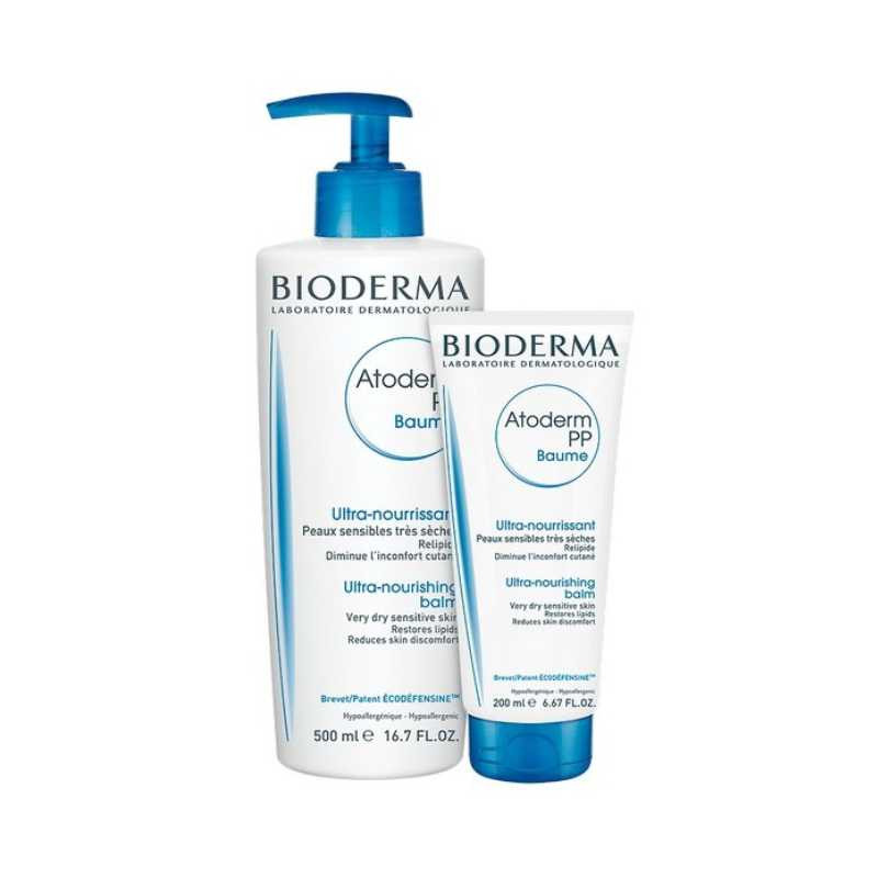Bioderma Atoderm PP Baume 500+200ml é um pack composto por 2 cuidados: Bioderma Atoderm PP Baume (500ml) e Bioderma Atoderm PP Baume (200ml).  Bioderma Atoderm PP Baume é um cuidado nutritivo, indicado para a pele muito seca, irritada a atópica. A fórmula contém ingredientes hidratantes e a Vitamina PP, oferecem uma hidratação intensa e facilitam a regeneração da barreira cutânea; Écodéfensine, reequilibra a flora cutânea; e Zantaleno, presente na formulação, confere ação antiprurido. Apresenta textura não oleosa e de rápida absorção. Excelente tolerância. Hipoalergénico. Sem perfume e sem parabenos. Como utilizar: aplicar 1 a 2 vezes por dia na pele perfeitamente limpa e seca, massajar suavemente até à completa absorção do produto.