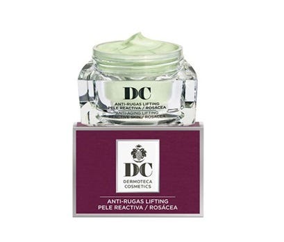 DC Anti-Rugas Lifting Pele Reativa/Rosácea tem filtros solares SPF12 que previnem o envelhecimento e fotoenvelhecimento da pele sensível, reativa ou com rosácea. Possui uma ação anti-rugas para a pele com rosácea conferida pela presença de uma substância ativa inovadora, retinol-like, a DHMC. A presença de antioxidantes previnem o envelhecimento cutâneo, uma vez que evitam a degradação das fibras elásticas da pele. Com propriedades calmantes, tem ainda na sua constituição substâncias com ação a nível da microcirculação, diminuindo a vermelhidão e a formação de derrames. Testado dermtologicamente. Hipoalergénico.