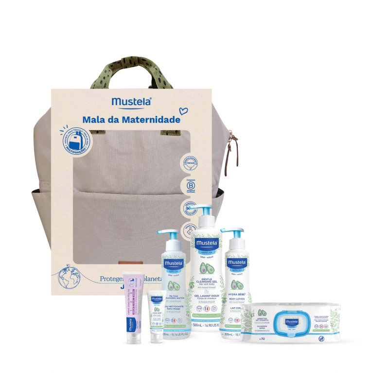 Mustela Bebé Mochila Maternidade é composta por 6 cuidados: Mustela Água de Limpeza (300ml);