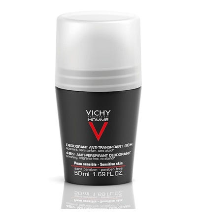 Vichy Homme Desodorizante pele sensível regula a transpiração e diminui os desconfortos da pele durante 48 horas. Graças ao formato em roll-on, a aplicação torna-se fácil e rápida. Fresco e suave ao aplicar.