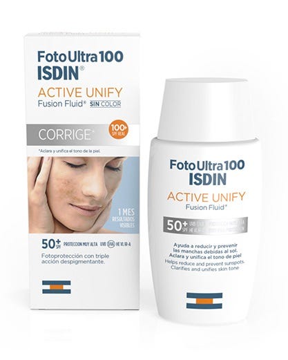 Foto Ultra 100 ISDIN Active Unify Fusion Fluid SPF 50+ ajuda a regular a produção de melanina graças ao DP3-Unify Complex, que atua sobre as principais fases da melanogénese. Oferece uma proteção 2 vezes superior ao mínimo requerido num protetor solar SPF 50+ face aos raios UVA, que estimulam o processo de pigmentação. A sua textura Fusion Fluid funde-se com a pele.
