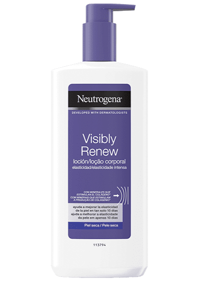 Neutrogena Visibly Renew Loção Corporal Elasticidade Intensa possui minerais ativos que ajudam a estimular a produção de colagénio. Ajuda a melhorar a flexibilidade e elasticidade da pele e proporciona hidratação diária. Apresenta uma textura não gordurosa e de rápida absorção.