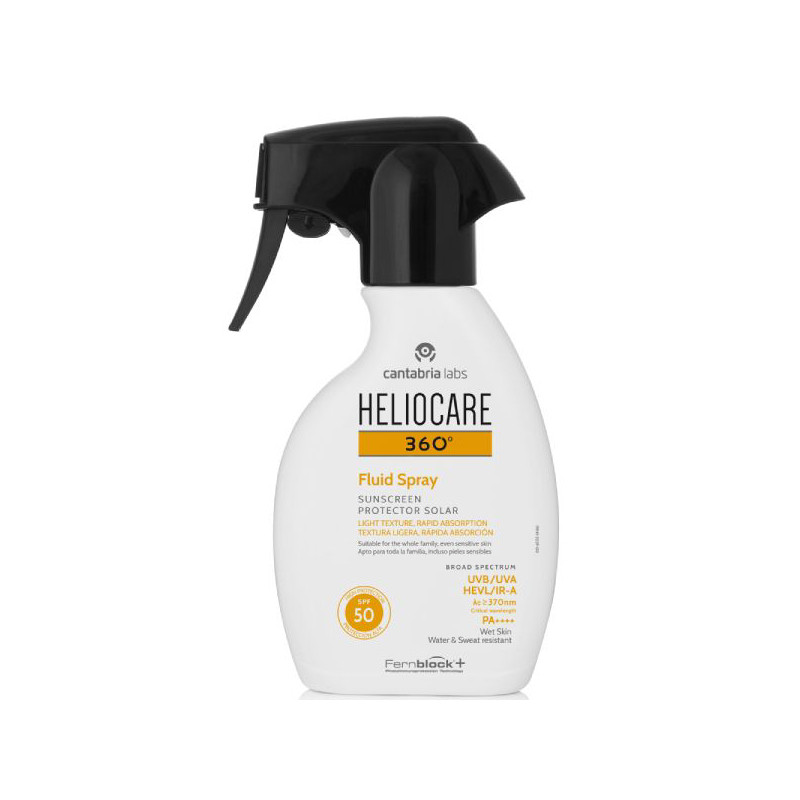 Heliocare 360º Fluid Spray FPS 50 é um protetor solar corporal, indicado para todos os tipos de pele, incluindo peles sensíveis. A fórmula contém uma combinação avançada de filtros solares que conferem elevada proteção UVB, UVA, IV-A e visível; e a tecnologia Fernblock® que neutraliza os radicais livres e repara os danos causados pelo sol. Textura suave e ultraleve que garante uma aplicação homogénea e um acabamento invisível. Rápida absorção. Não comedogénico. Resistente à água e ao suor. Pode ser aplicado em pele húmida. Testado sob controlo dermatológico, pediátrico e oftalmológico.