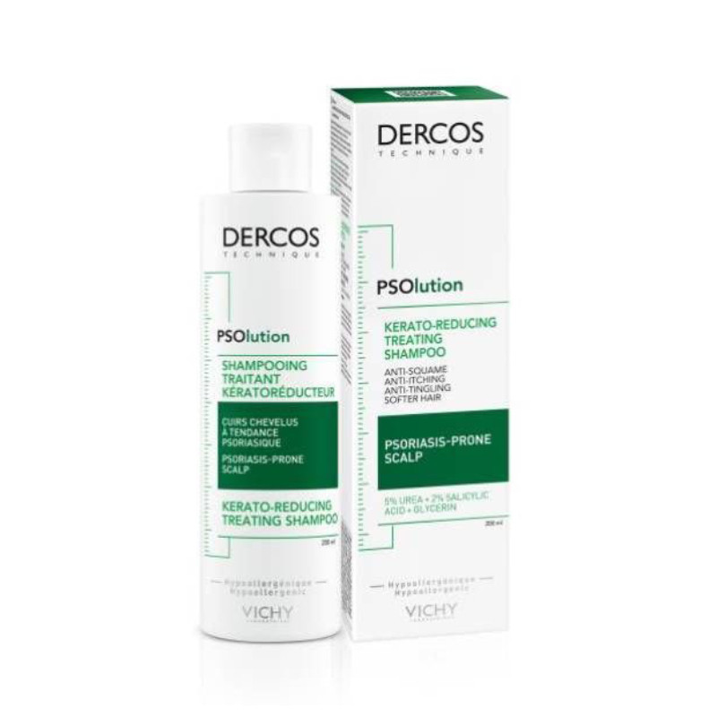 Vichy Dercos PSOlution Champô é um cuidado de higiene capilar, indicado para couro cabeludo com tendência a psoríase, descamação e prurido. A fórmula contém ureia que remove eficazmente as escamas; ácido salicílico com ação esfoliante; e glicerina com ação hidratante. Acalma de imediato o couro cabelo, diminuindo o ardor e comichão. Hipoalergénico.