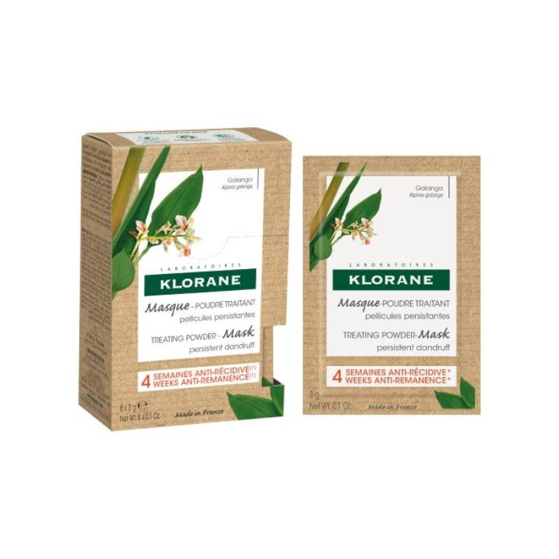 Klorane Capilar Galanga Máscara em Pó é um cuidado de higiene capilar 2 em 1, indicado para couro cabeludo com caspa. A sua fórmula contém galanga com ação purificante; argila branca para suavizar a acalmar; e argila verde para controlar o excesso de sebo. O pó quando entra em contacto com a água transforma-se numa espuma cremosa que lava suavemente e ajuda a eliminar a caspa mais persistente. Reequilibra e suaviza o couro cabeludo, prevenindo o reaparecimento da caspa até 4 semanas. Perfume amadeirado. Contém 8 saquetas.