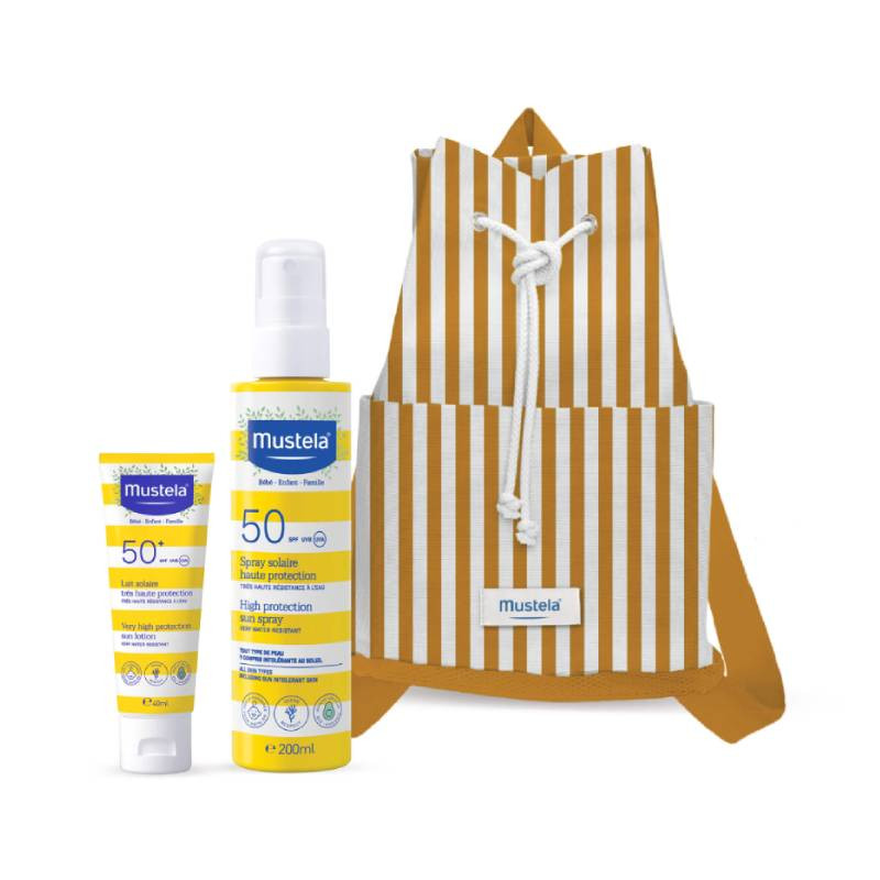 Mustela Solar Mochila Riscas Amarela é composta por: Mustela Leite Solar Rosto FPS50 (40ml) e Mustela Solar Spray FPS50 (200ml).