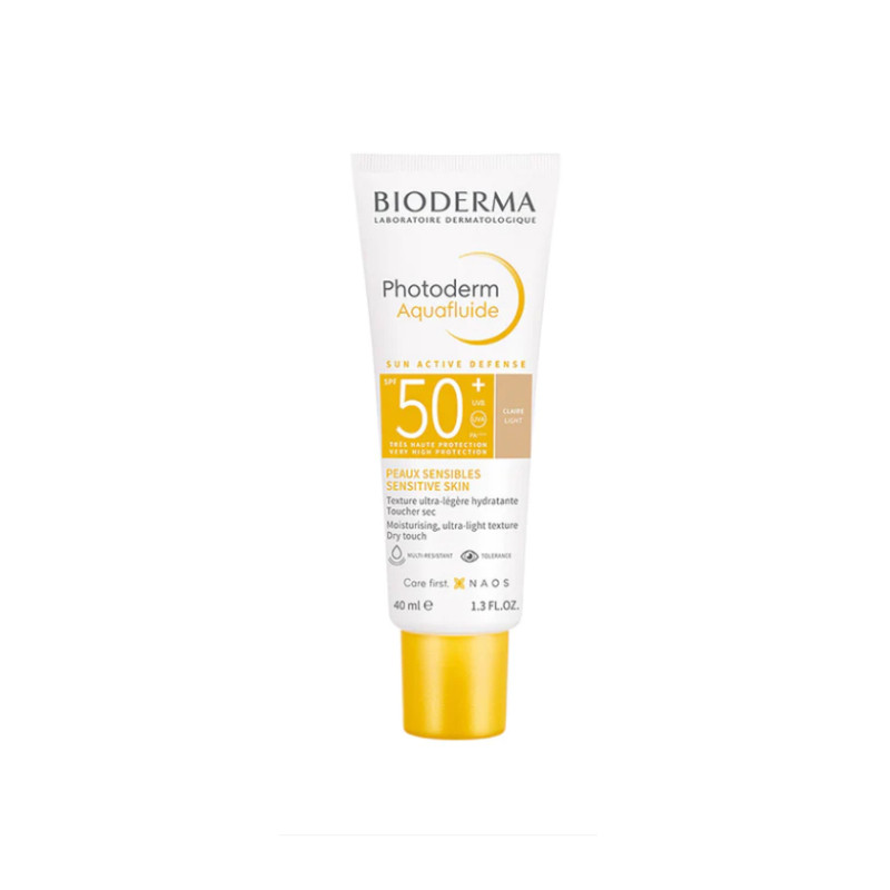 Bioderma Photoderm Aquafluide FPS50+ Claro é um protetor solar de rosto com acabamento claro, indicado para pele sensível. Acabamento invisível. Não colante. Não gorduroso. Excelente base de maquilhagem. A fórmula combina: - Sun Active Defense, proteção solar de alta tecnologia, reforçada contra os raios UVA;