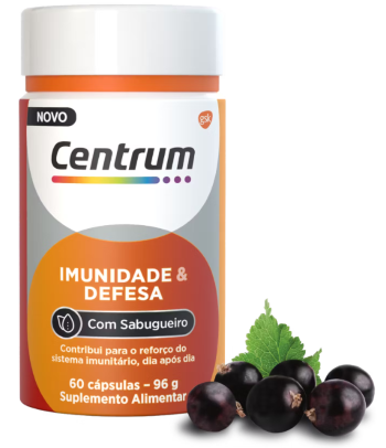Suplemento alimentar com vitaminas, minerais e extrato de baga de sabugueiro que contribuem para o aumento das defesas naturais do organismo, e proteção das células contra o stress oxidativo.