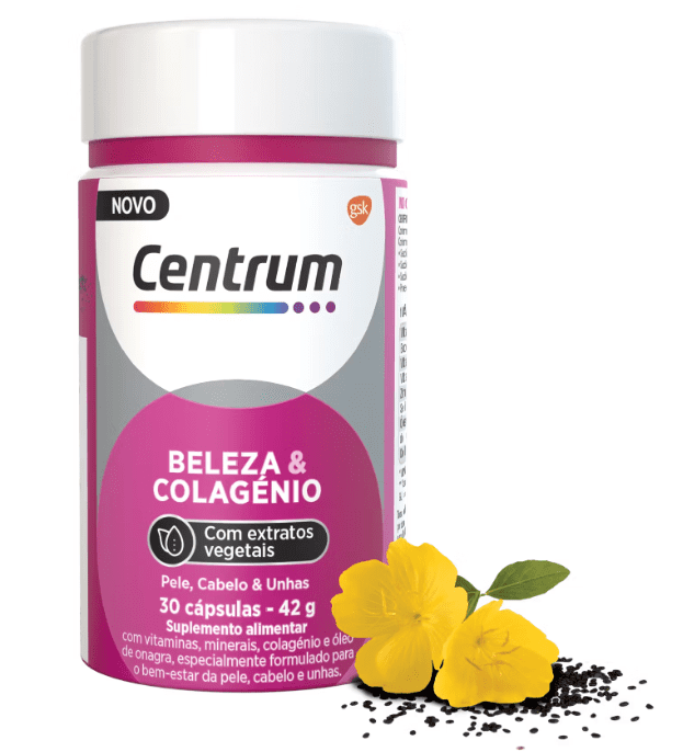 Suplemento alimentar que contém óleo de onagra que contribui para saúde da pele e colagénio, um componente da pele. Contém vitaminas e minerais que contribuem para a saúde da pele, cabelo, unhas e para a proteção das células contra o stress oxidativo