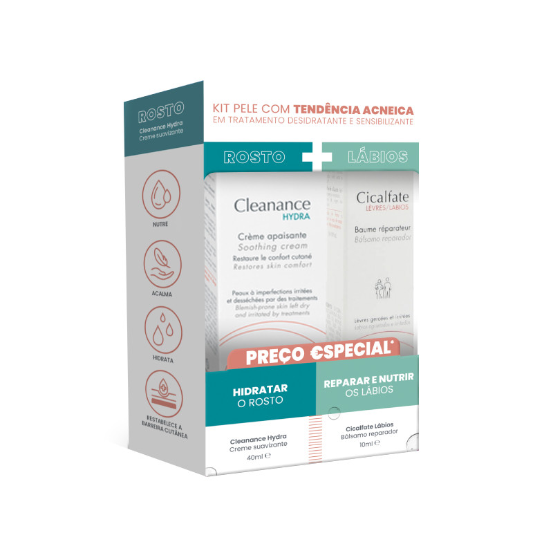 Avène Cleanance Hydra + Cicalfate Bálsamo Labial é um pack composto por 2 cuidados: Avène Cleanance Hydra Creme Suave (40ml) e Avène Cicalfate Bálsamo Labial Reparador (10ml). Avène Cleanance Hydra Creme Suave é um cuidado hidratante e suavizante indicado para pele sensível e desidratada, em consequência de tratamentos medicamentosos anti-acneicos. A sua fórmula contêm sulfato de dextrano, com ação suavizante; e água termal d'Avène com ação calmante. Nutre e hidrata a pele, contribui para o restabelecimento do filme hidrolipídico, acalma a irritação e atenua a vermelhidão. Textura suave, não colante e rapidamente absorvida. Não comedogénico. Avène Cicalfate Bálsamo Labial Reparador é um cuidado reparador de lábios, indicado para toda a família. A fórmula contém sucralfato; sulfato de cobre e zinco, com ação reparadora, que reparam a epiderme e diminuem a proliferação bacteriana; e água termal d'Avène, com ação calmante. Repara, nutre e protege de forma prolongada os lábios gretados e zonas muito secas e irritadas. Não comedogénico.