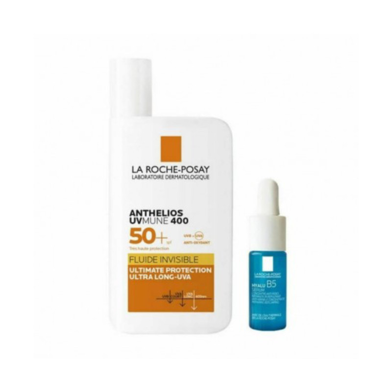 La Roche-Posay Anthelios UVMUNE 400 Fluido 50+ Oferta La Roche-Posay Hyalu B5 Sérum é composto por 2 cuidados de rosto: La Roche-Posay Anthelios UVMUNE 400 Fluido 50+ (50ml) e La Roche-Posay Hyalu B5 Sérum 10ml. La Roche-Posay Anthelios UVMUNE 400 Fluido 50+ é um cuidado solar de rosto com proteção avançada de largo espectro, indicado para pele sensível e reativa. Pode ser aplicado no contorno dos olhos. Ultrafluido. Acabamento invisível. Não gorduroso. Não pegajoso. Sem perfume. La Roche-Posay Hyalu B5 Sérum é um cuidado reparador que reduz significativamente as rugas, indicado para pele sensível, mesmo após procedimentos superficiais. Repara a barreira da pele. A fórmula contém Vitamina B5, melhora o processo de reparação da pele;  Madecassoside, ajuda na renovação da pele; Ácido Hialurónico, reduz as rugas, recheia a pele e aumenta o volume e a elasticidade da pele. Textura suave, fresca e fluida para confortar a sua pele.